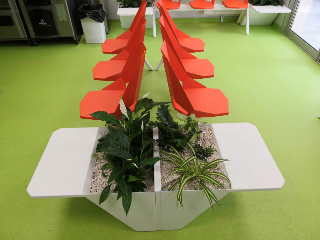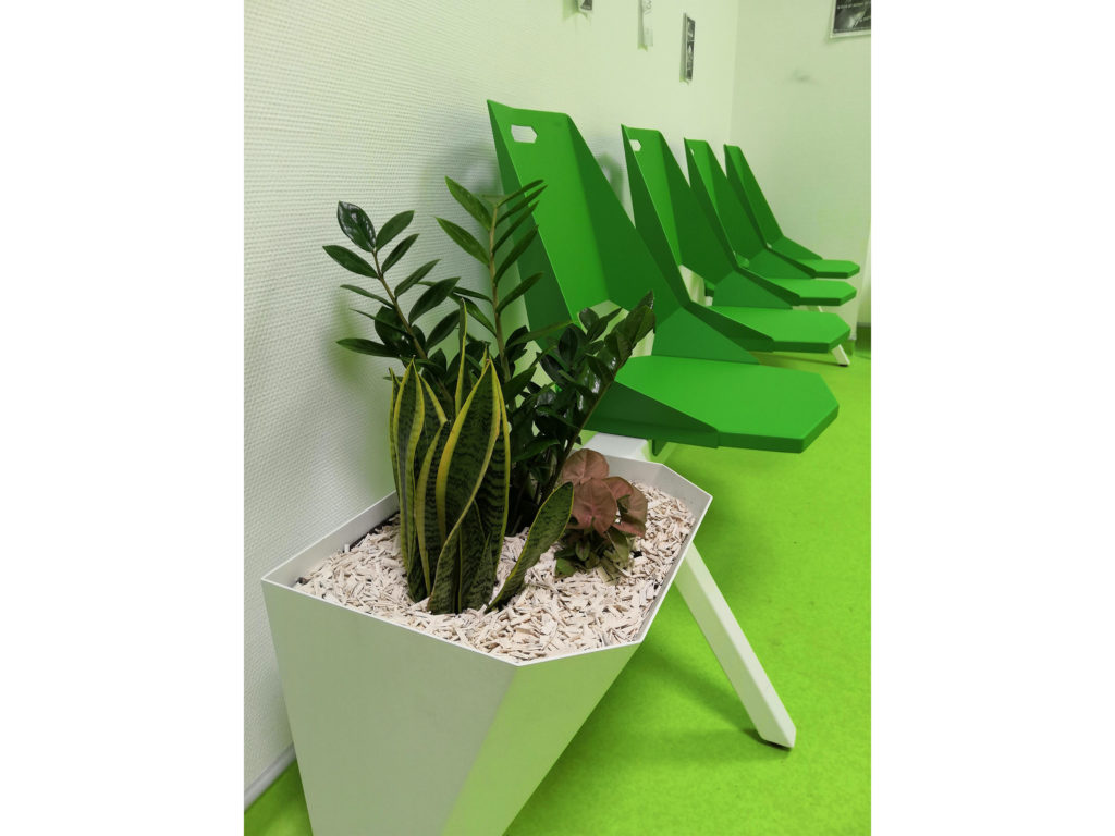 C’est un mélange de gaieté et de design de part le choix des formes et des couleurs de cet établissement recevant du public (ERP). L’ensemble du mobilier est fabriqué en métal thermolaqué dans le respect des normes d’hygiène pour un usage en hôpital ou centre médical mais également partout ailleurs. Afin d’apporter plus de vie, nos designers ont intégré des pot de fleur pour végétaliser cet espace. Pour des raisons d’entretien propre à chaque établissement, vous pouvez faire le choix de vraies au fausses plantes. Pour tout projet de salle d’attente unique et design, vous pouvez nous contacter afin d’établir un cahier des charges : design, quantité, couleur, végétalisation, etc.